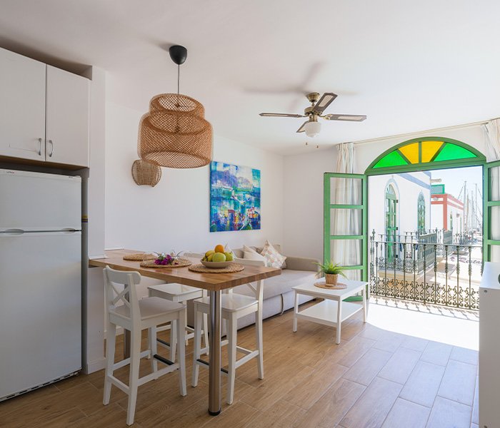 2-bedroom apartment with 1 sofa bed, air conditioning and free Wi-Fi. Enjoy a private roof terrace a balcony with a view of Mogan’s charming streets and a french balcony overlooking the harbor. The kitchen comes fully equipped for a comfortable and complete stay experience.